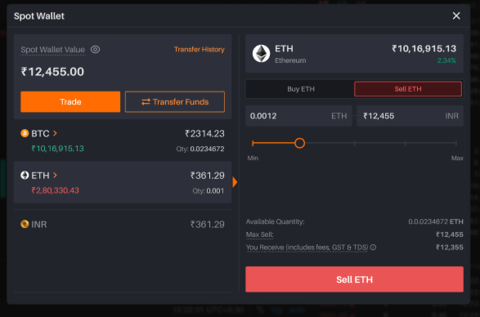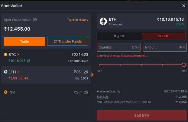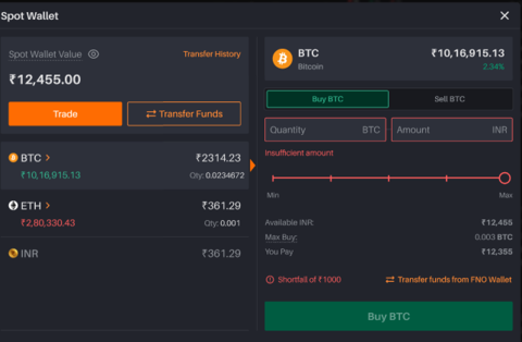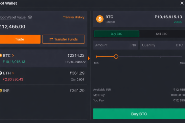 Before buying crypto, ensure that sufficient INR balance is available in your Spot Wallet. If required, transfer funds from another wallet to the Spot Wallet.