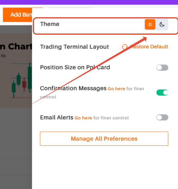 Delta Exchange allows you to easily switch between Dark and Light themes for a more comfortable trading experience, based on your preference.